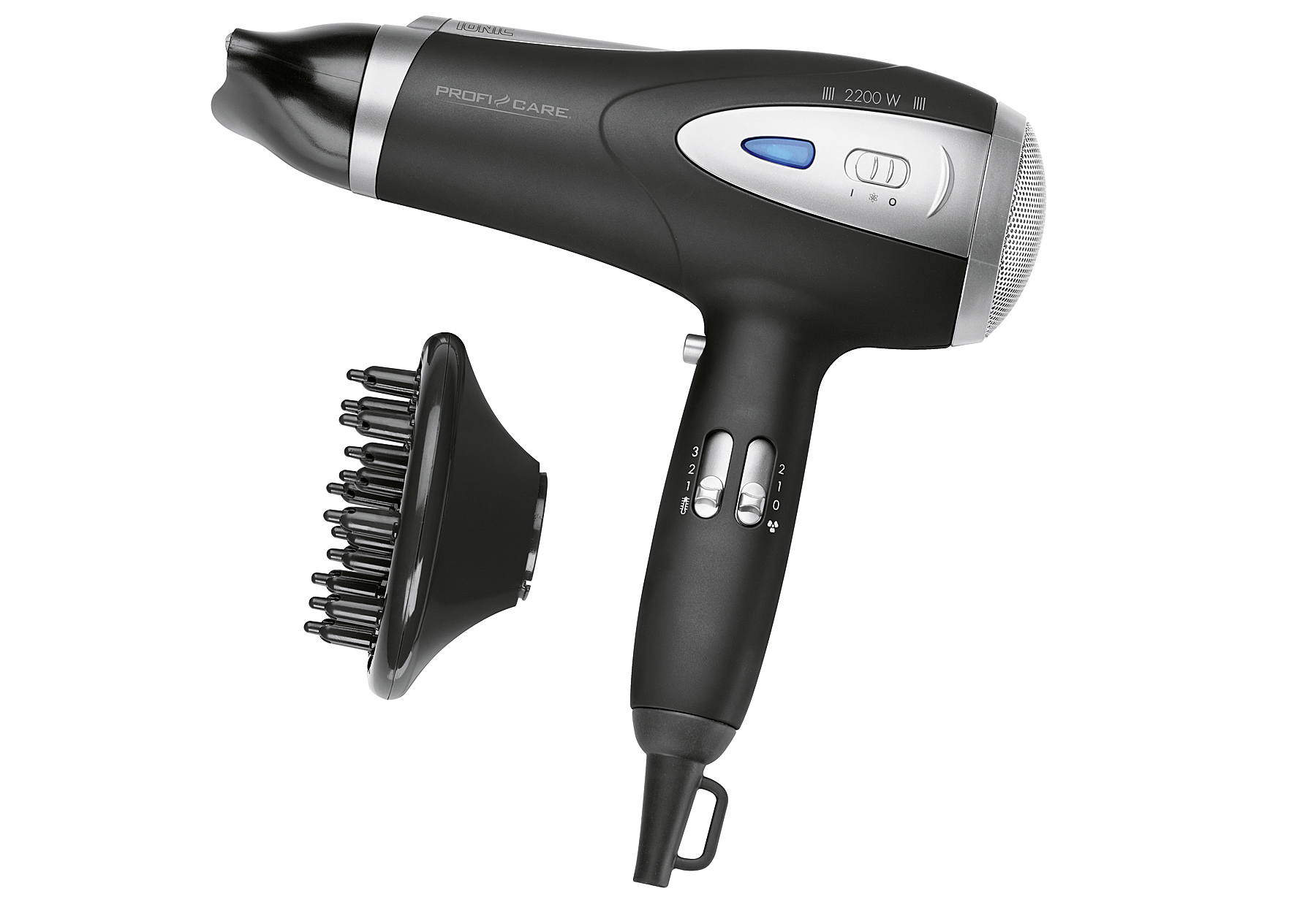 Ionisierungsfunktion – bessere Frisierbarkeit durch Anti-Statik-Effekt - das Haar trocknet nicht aus und wird geschmeidig und glänzend (zuschaltbar), 3 Temperatur-/Leistungsstufen, 2 Gebläsestufen, Cool Shot, inkl. professionellem Volumen-Diffusor und Formdüse (360° drehbar und abnehmbar), Soft Touch-Gehäuse, Lufteinlassfilter (abnehmbar), Überhitzungsschutz, Aufhängeöse, 230 V, 50/60 Hz, 2200 W